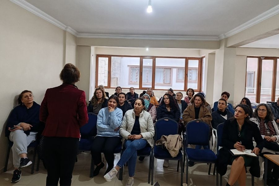 EMEP Milletvekili Sevda Karaca, Bornova’da kadınlarla bir araya gelerek savaş, kriz, maden yasası, Kürt sorununda 'çözüm' tartışmaları ve yaklaşan 25 Kasım’a dair değerlendirmelerde bulundu.