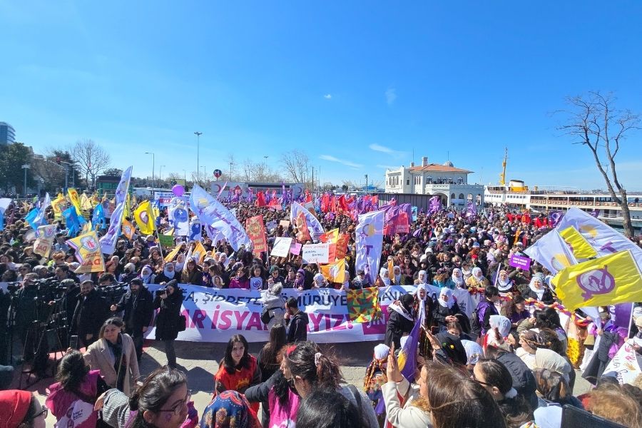 Yürüyüşün ardından binlerce kadın Rıhtım'daki miting alanına giriş yaptı. Kadınlar alana sığmazken girişler devam ediyor.