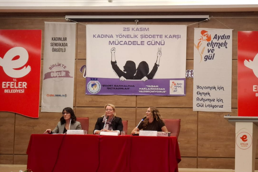 Aydın Efeler’de 25 Kasım Kadına Yönelik Şiddete Karşı Uluslararası Mücadele Günü kapsamında, 21 Kasım’da Nevzat Biçer Konferans Salonu’nda Aydın DİSK Genel-İş Şubesi ve Aydın Ekmek ve Gül Grubunun ortaklaşa düzenlediği “Şiddet Sarmalında İşçi Kadınlar” konulu panelde kadın işçilerin ağırlıkta olduğu bir buluşma gerçekleşti.