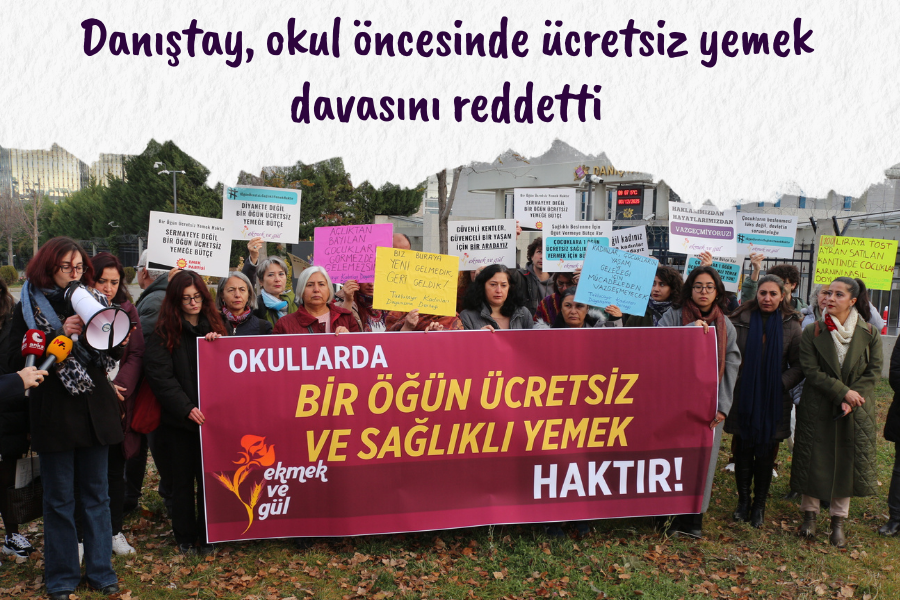 2022 yılında Ekmek ve Gül’ün çağrısıyla başlayan “Okullarda bir öğün ücretsiz sağlıklı yemek her çocuğun hakkı!” kampanyası ile Türkiye’nin pek çok ilinde kadınlar, veliler, eğitimciler ve pek çok kurum mücadele etmiş, yüz binleri aşan sayıda imza toplamıştı. Milletvekilleri yasa ve ek bütçe önergeleri vermişti. Talebin geniş kesimlerce sahiplenilmesinin ardından Milli Eğitim Bakanlığı 2023 yılında tüm okul öncesi eğitimde ücretsiz yemek uygulamasına başlandığını duyurmuştu. 6 Şubat depremlerinin ardından sadece bir dönem süren bu uygulama, sessiz sedasızca deprem bölgesindeki 11 il ile sınırlandırıldı. Bunun üzerine Esenyalı Kadın Dayanışma Derneği, okul öncesi eğitimde ücretsiz yemek uygulamasının kaldırılmasına karşı MEB’e dava açtı. Dernek, 2023 yılında uygulamanın iptaline karşı yürütmenin durdurulmasını talep etti ve dava açtı; ancak çocukların açlığını önlemek için hızla değerlendirilmesi gereken bu talep 8 ay sonra reddedildi. Davanın açılmasının üzerinden 2 yıl geçmesine rağmen duruşma tarihi 2025 yılında belirlendi. Bu süreçte yoksulluk derinleşti, çocukların beslenme sorunu ağırlaştı. 3 Aralık 2025’te Danıştay 8. Dairesinde görülen duruşmada dernek, ücretsiz okul yemeğinin çocukların eğitim hakkı, sağlık hakkı ve fırsat eşitliğiyle doğrudan ilişkili olduğunu vurguladı. Savcılık görüşünde; okul öncesi eğitimin “isteğe bağlı” olduğu, bu eğitimin amaçları arasında çocuklara ücretsiz beslenme sağlanmasının bulunmadığı belirtilmişti. Bu, bir öğün ücretsiz yemek talebi için MEB’e açılan ilk dava değildi. Bu davadan ayrı olarak, okullarda bir öğün ücretsiz sağlıklı yemek kampanyanın bir parçası olan Ankara Tuzluçayır Kadınları Dayanışma Derneği, MEB’e tüm okullarda bir öğün ücretsiz sağlıklı yemek verilmesi için dava açmıştı. Ankara 3. İdare Mahkemesi, uygulamayı takdir yetkisine bırakarak MEB’in çocukları aç bırakabileceğine karar vermişti.