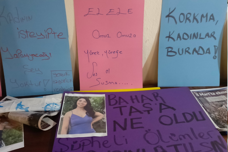 Kadınlar, Gebze Meydanı'nda gerçekleşecek 8 Mart mitingi için taleplerini taşıyacakları dövizleri yazdı.