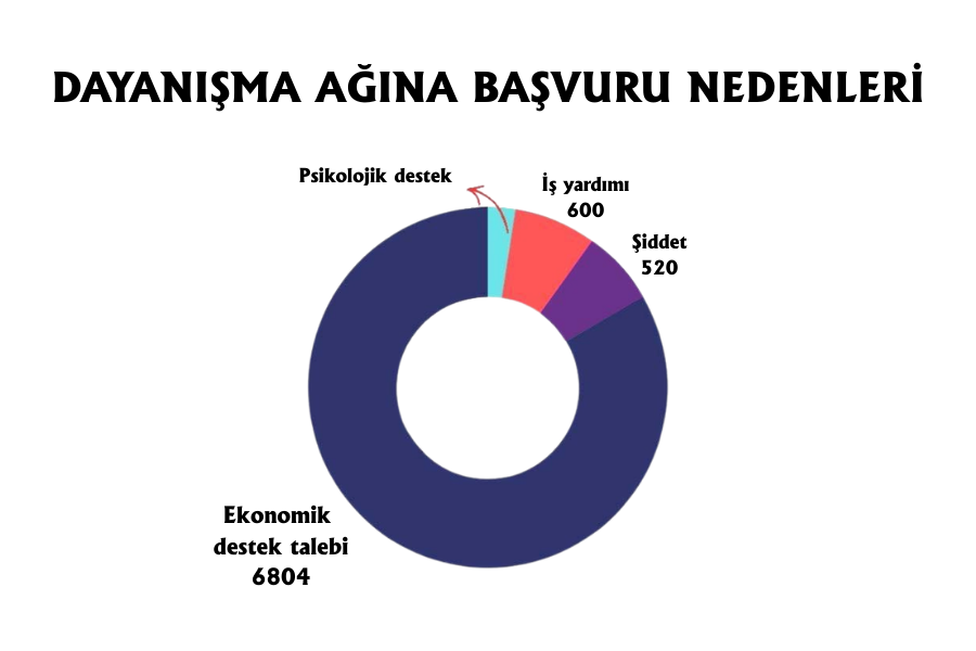Tablo böyleyken derneğe yapılan yardımların ciddi bir ağırlığını -yüzde 81’ini- ekonomik destek talepleri oluşturuyor. Yoksulluk ile şiddetin kopmaz bağı, ekonomik destek başvurularının arkasından şiddet hikayelerini de çıkarıyor. 6 bin 804 kişi ekonomik destek talebi ile derneğe ulaştı. 3 bin 160 kadın ekmek, gıda, fatura, kira, giyim gibi ihtiyaçlarını karşılamak için ekonomik destek için dayanışma ağına başvurdu.