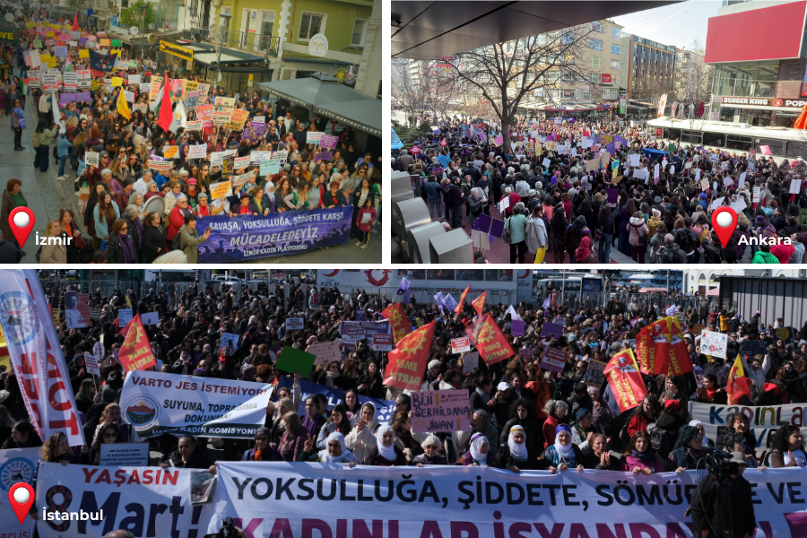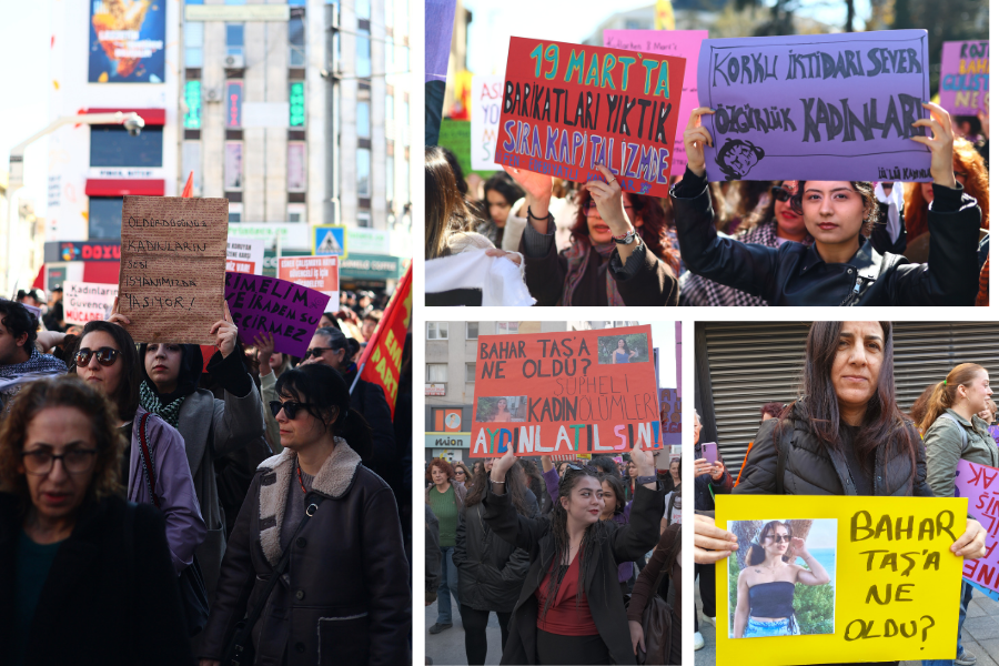 8 Mart’ta öne çıkan bir diğer gündem ise savaştı. İsrail ve ABD’nin Filistin’e yönelik soykırımı kadınlarca unutulmadı; özellikle İran’a dönük saldırılar kadınlar açısından büyük öfkeyle karşılandı. İran’ın bölgedeki NATO üslerini vurması ve Türkiye’nin olası bir hedef olması da kadınlardaki güvenlik kaygılarını büyütürken “Üsler kapatılsın” sloganına güçlü bir zemin hazırladı. Kadınlar sıcak bir savaş içinde olmasalar dahi, halk için harcanabilecek bütçenin “savunma” adı altında savaş için ayrıldığını ve bunun yoksulluğu da kadına yönelik şiddeti de büyüttüğünü vurguladı. Keza bayramda verilmesi planlanan emekli ikramiyesinde “savaş koşulları” nedeniyle artış olmayacağının duyurulması, kadınların kaygısının somut karşılığıydı.