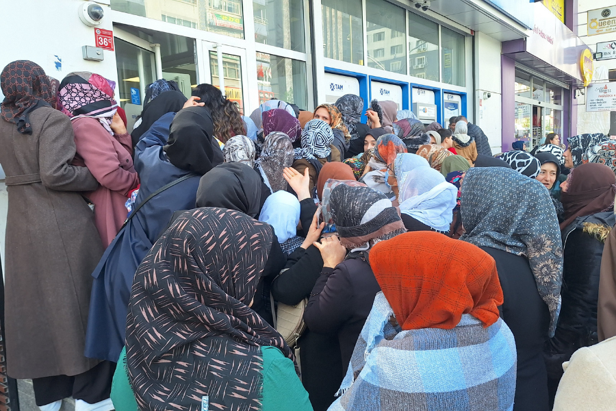Diyarbakır'ın Ofis semtindeki Halkbank şubesi önünde toplanan kadınlar, banka önünde uzun kuyruklar oluşturdu. Sosyal yardım ödemesi yapılacağı yönündeki söylentiler üzerine bankaya akın eden onlarca kadın içeri girmeye çalışınca kısa süreli izdiham yaşandı.