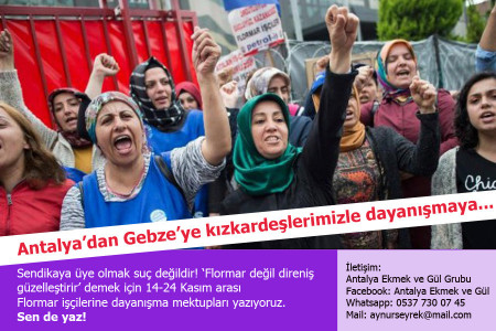 Antalya Ekmek ve Gül Grubundan kadınlar sendikalaştıkları için işten atılan Flormar işçisi kadınlara dayanışma mektupları gönderiyor.