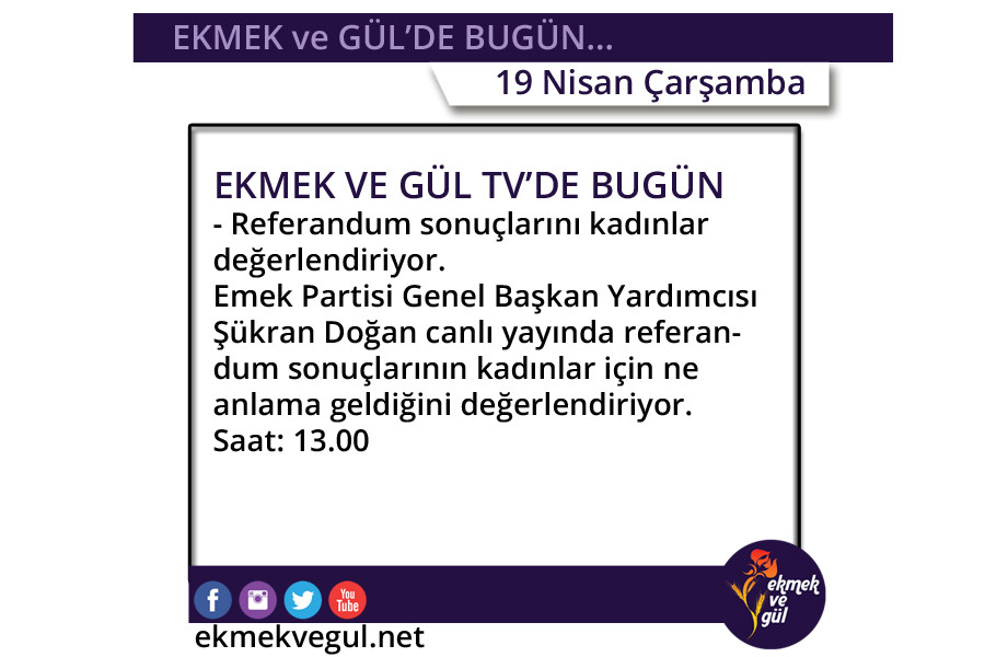 Emek Partisi Genel Başkan Yardımcısı Şükran Doğan canlı yayında referandum sonuçlarını değerlendiriyor. Sosyal medya hesaplarımızdan yorum yaparak sohbetimize dahil olabilirsiniz. Kaçırmayın...