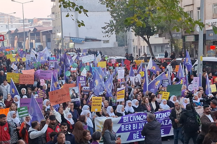 Dicle Amed Kadın Platformu ve Diyarbakır Şiddetle Mücadele Ağı çağrısıyla binlerce kadın Eski Cezaevi önünde toplandı. Buradan Ofis AZC Plaza önüne yürüyen kadınlar sık sık "Jin, jiyan, azadî" sloganı attı. Kadınlar Rojin Kabaiş ve katledilen birçok kadının fotoğrafını taşıdı.