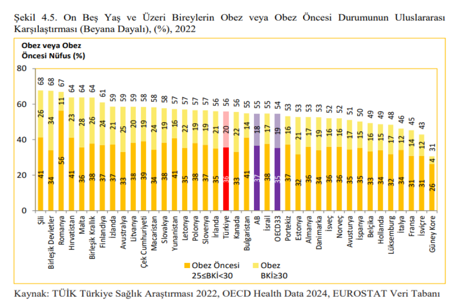 TÜİK, EUROSTAT ve OECD’nin 2022 yılına ait uluslararası karşılaştırmalı verilere göre Türkiye’de 15 yaşından büyük her 100 kişiden 56’sı fazla kilolu; bunların yüzde 35’i ise obez. Bu oran Türkiye’yi OECD ve AB ortalamalarının çok üstüne yerleştiriyor. OECD ülkeleri arasında obezite oranı en yüksek 10 ülke içinde yer alıyor. Bu verilere göre 15 yaşından büyük her üç kişiden biri obez.